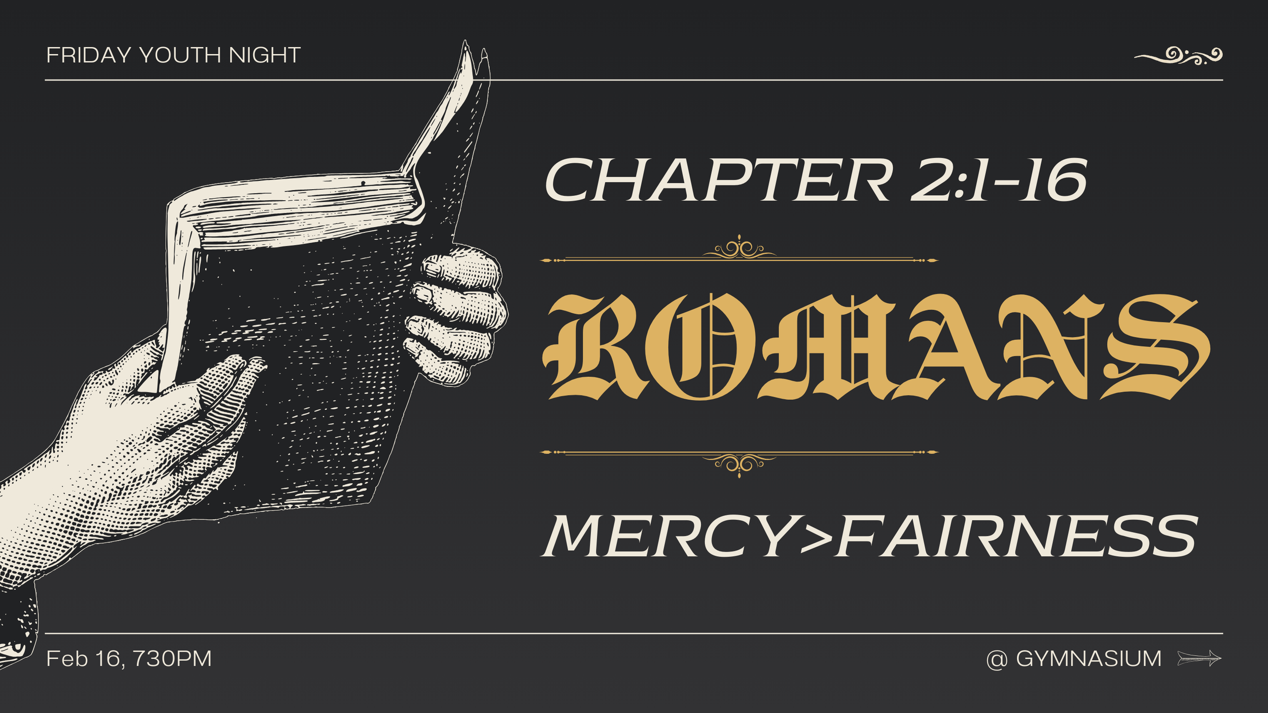 Join us for Friday Youth Night on February 16th, Friday at 730pm in the Gym as we continue our exploration of the book of Romans together. This week, we will examine Romans 2 with a focus on the theme of ‘Mercy>Fairness’. Come join us as we praise the LORD, play games, and deepen our understanding of God together.